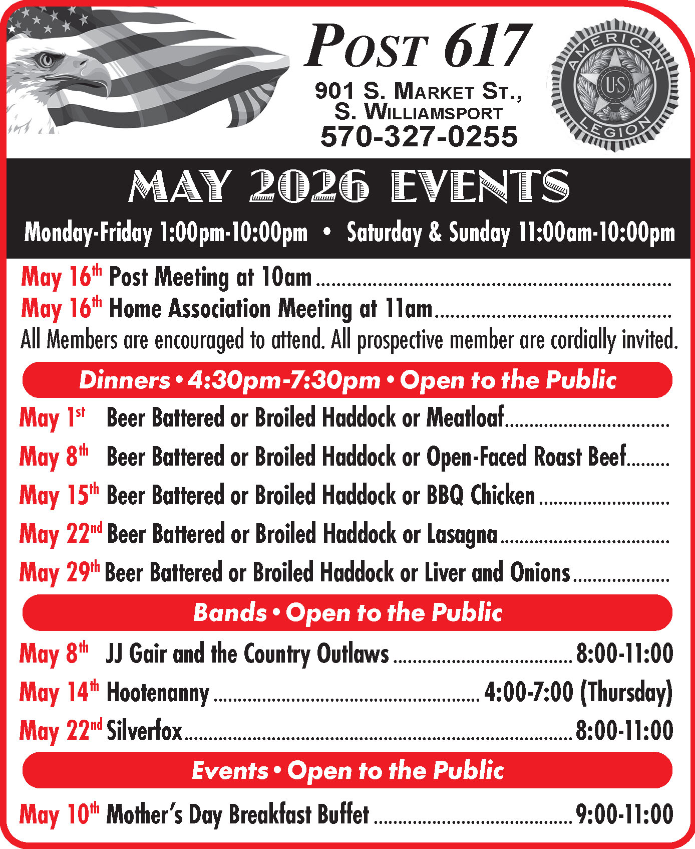 There will be a wide offering a Trunk-or-Treat activities across the county. These include Muncy Trunk-or-Treat from 6 to 8 p.m. at Muncy High School. Clinton Township Fire Company will have from 6:30 to 9:30 p.m. There will be a charge of $6 per car. The Montgomery Lions will have a Halloween Parade at 6 p.m., with Trick-or-Treating to follow from 6:30 to 8:30 p.m.