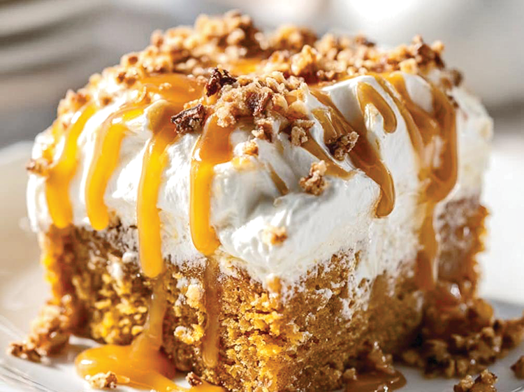 While the cake is still warm, use the handle of the wooden spoon to poke holes throughout the cake about 1 inch apart. Slowly pour the condensed milk over the cake, allowing it to soak into the holes. Let the cake cool completely, then top with Cool Whip, drizzle on caramel, and sprinkle with a Heath candy bar. Refrigerate the cake for at least an hour before serving to allow all the flavors to marry.