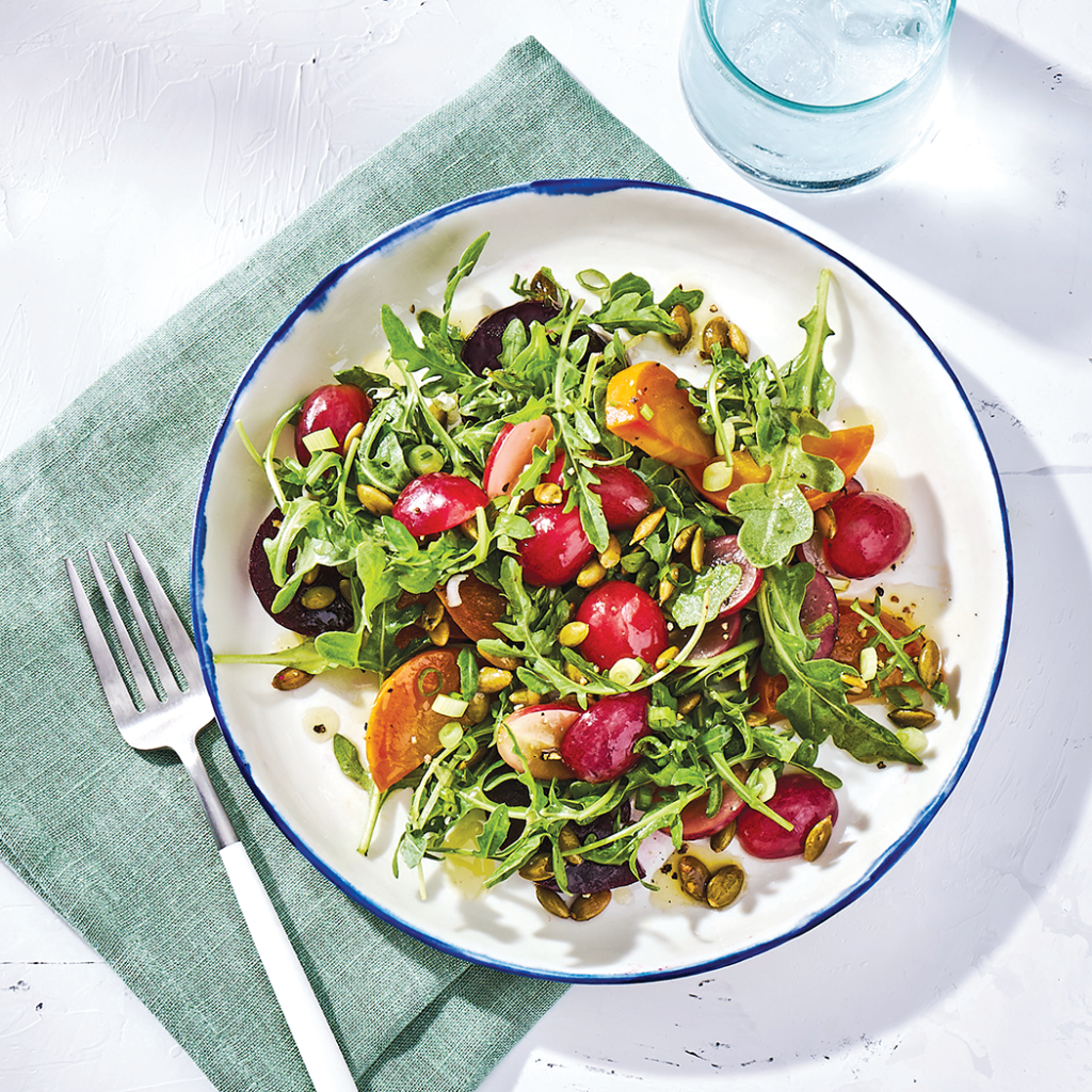 Add grapes and pumpkin seeds to bowl with dressing and toss well to coat. Add cooled beets, green onions and arugula. Toss lightly; season with pepper, to taste.