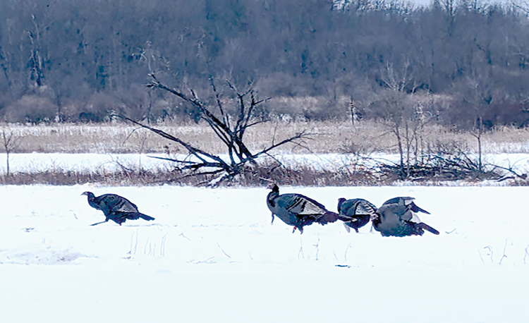 Once the cold, heavier snow takes hold, as we are experiencing now, turkeys may begin to concentrate into relatively large flocks, like the flock my wife and I saw last week. It’s not something we have experienced in recent years, but heavy snowfall can certainly be a problem for turkeys when it comes to finding food and getting to it. A turkey’s legs aren’t all that long, so trying to scrape through a couple of feet of snow would prevent eating.