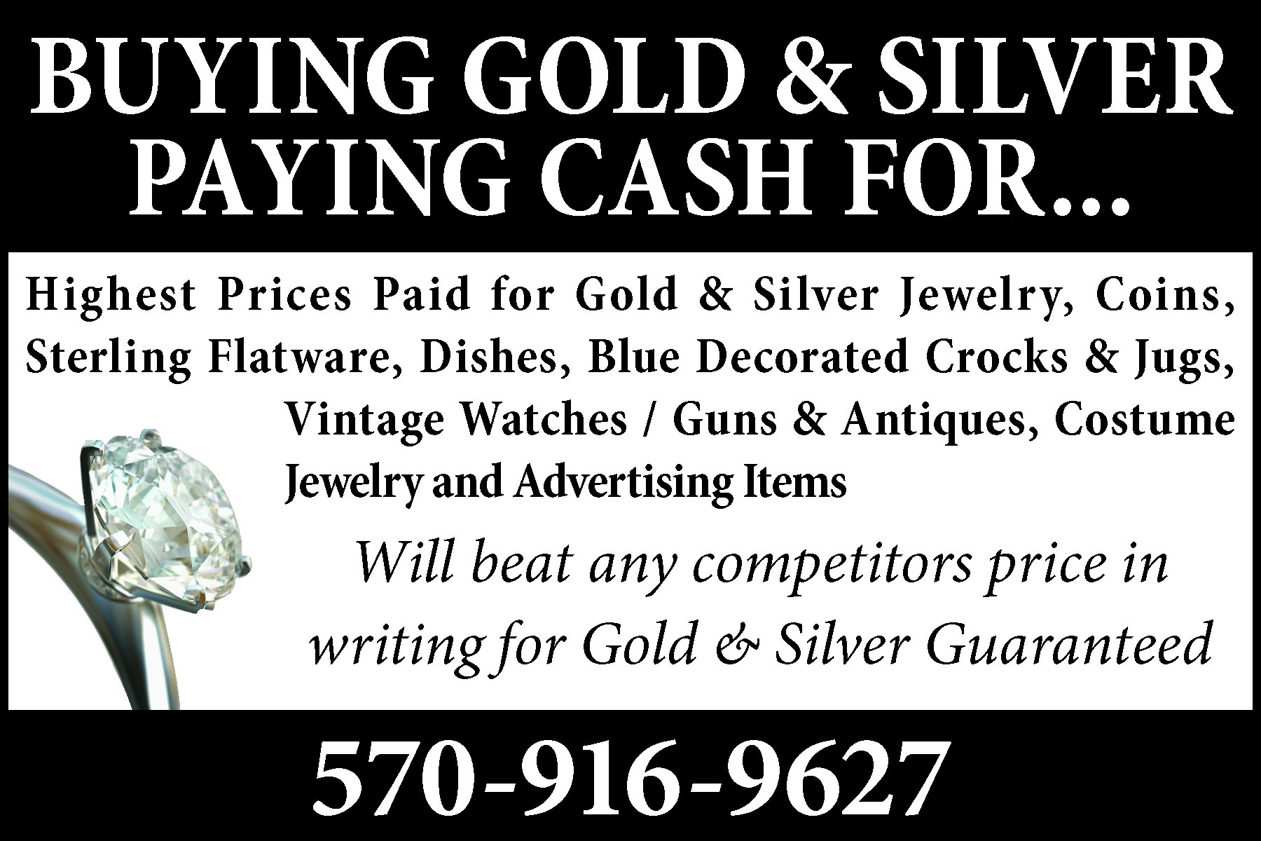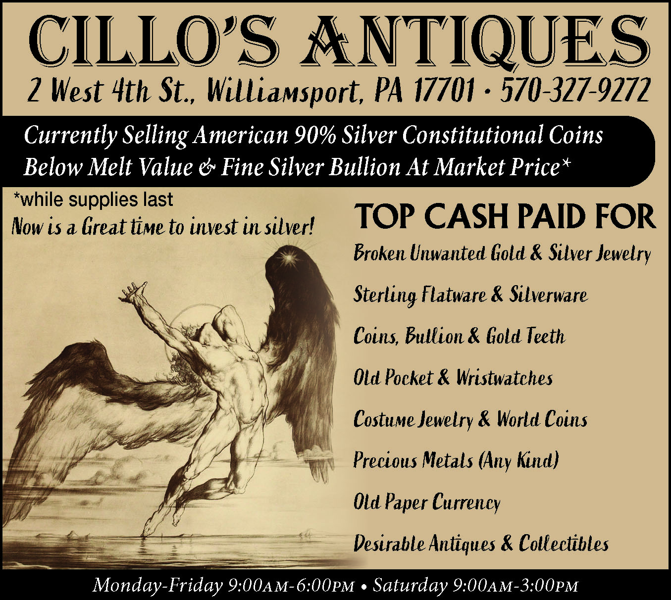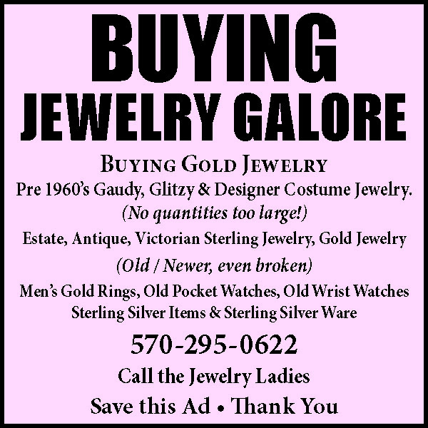 CALLAHAN’SANTIQUITIES381 Broad Street Montoursville,PA. ALWAYS BUYINGQuality Antiques, Gold, SilverTop Prices Paid WithImmediate Payment.One Piece or Whole Estates.“Member of Certified AppraisersGuild of America”.Open Thursday, Friday, &Saturday 11 a.m. to 5 p.m.570-368-2597.197329