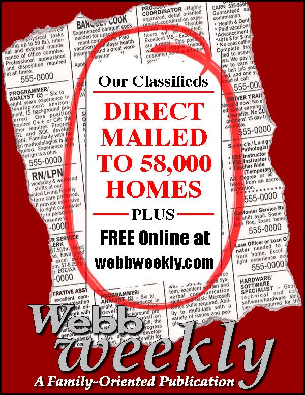 WEBB WEEKLY CLASSIFIEDADS GET RESULTS.DIRECT MAILED TOOVER 58,000 HOMES ANDBUSINESSES.TAKE ADVANTAGE OFOUR SPECIAL,3 LINES FOR 4 WEEKS,ONLY $15.95.CALL CLASSIFIEDDEPARTMENT AT 570-326-9322