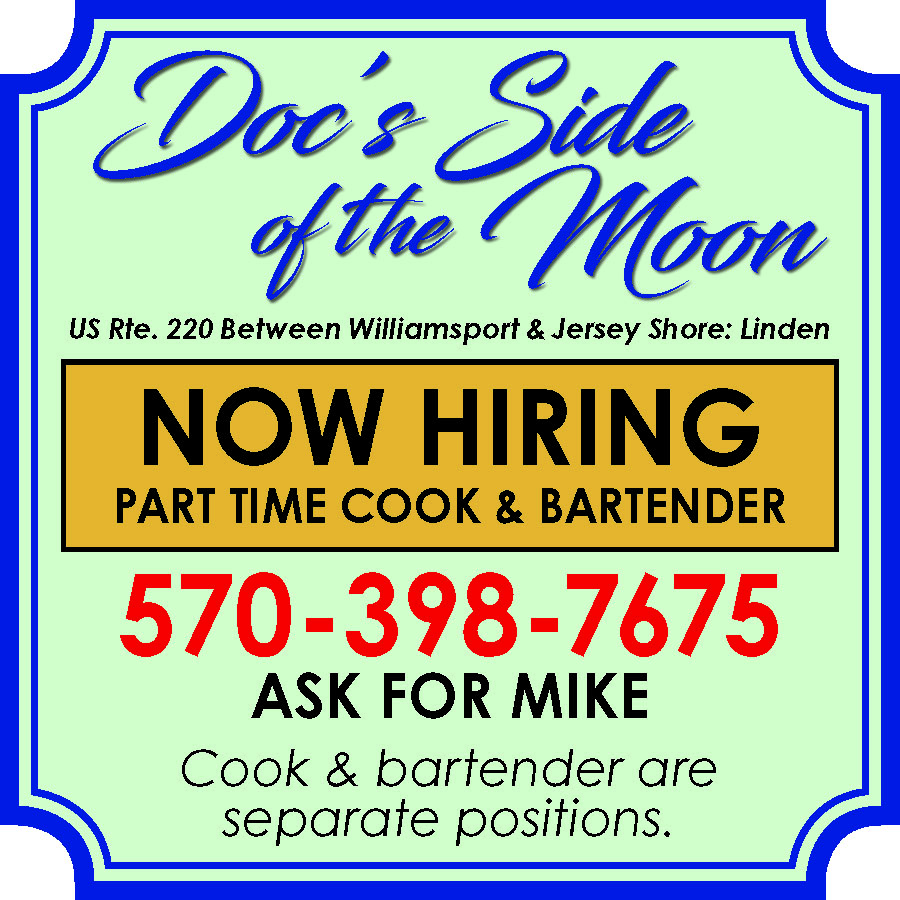 HELP WANTED, DOC’SSIDE OF THE MOON,Linden. Now hiring Part timeCook. Bartender. 570-398-7675. Ask for Mike. Cook andbartender are separate positions.197789