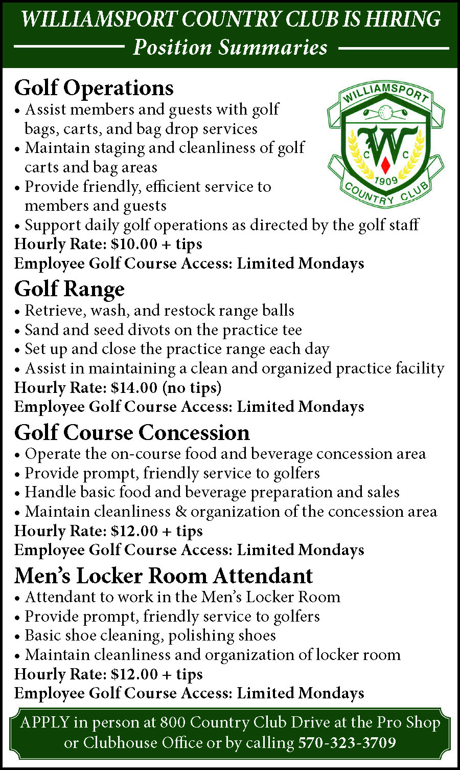HIRING FOR SEASONALGROUNDSKEEPING.Starting Pay $13.50. Inquire AtJersey Shore Cemetery, 1103Locust Street, Jersey Shore.570-398-1863. 197790