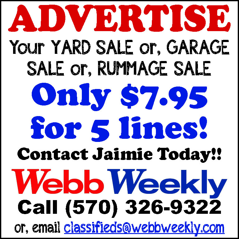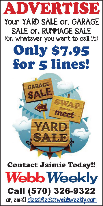 ADVERTISE your Yard Sale,Garage Sale, or RummageSale! Only $7.95 for 5 lines!Contact Jaimie Today!! CallWebb Weekly at (570) 326-9322 or email classifi eds@webbweekly.com