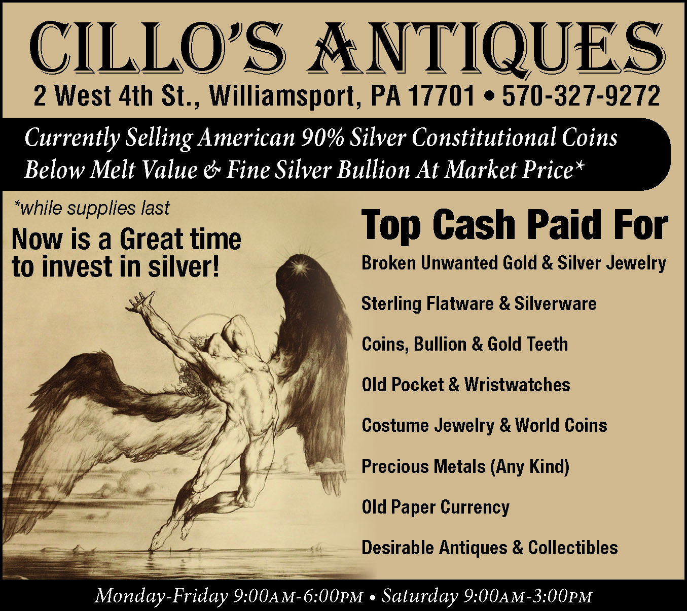 CALLAHAN’S ANTIQUITIES 381 Broad Street Montoursville, PA. ALWAYS BUYING Quality Antiques, Gold, Silver Top Prices Paid With Immediate Payment. One Piece or Whole Estates. “Member of Certified Appraisers Guild of America”. Open Thursday, Friday, & Saturday 11 a.m. to 5 p.m. 570-368-2597. 1978021