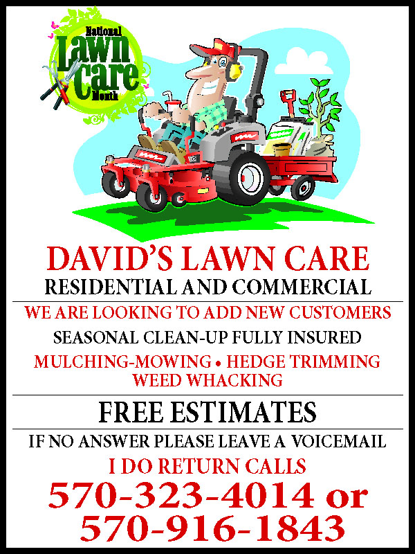 DAVID’S LAWN CARE RESIDENTIAL WE ARE LOOKING TO ADD NEW CUSTOMERS FULLY INSURED MULCHING-MOWING- SPRING CLEAN-UPHEDGE TRIMMINGWEED WHACKING FREE ESTIMATES IF NO ANSWER LEAVE A VOICEMAIL I RETURN CALLS 570-323-4014 OR 570-916- 1843. 198365