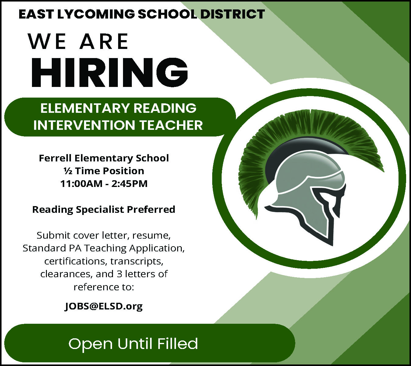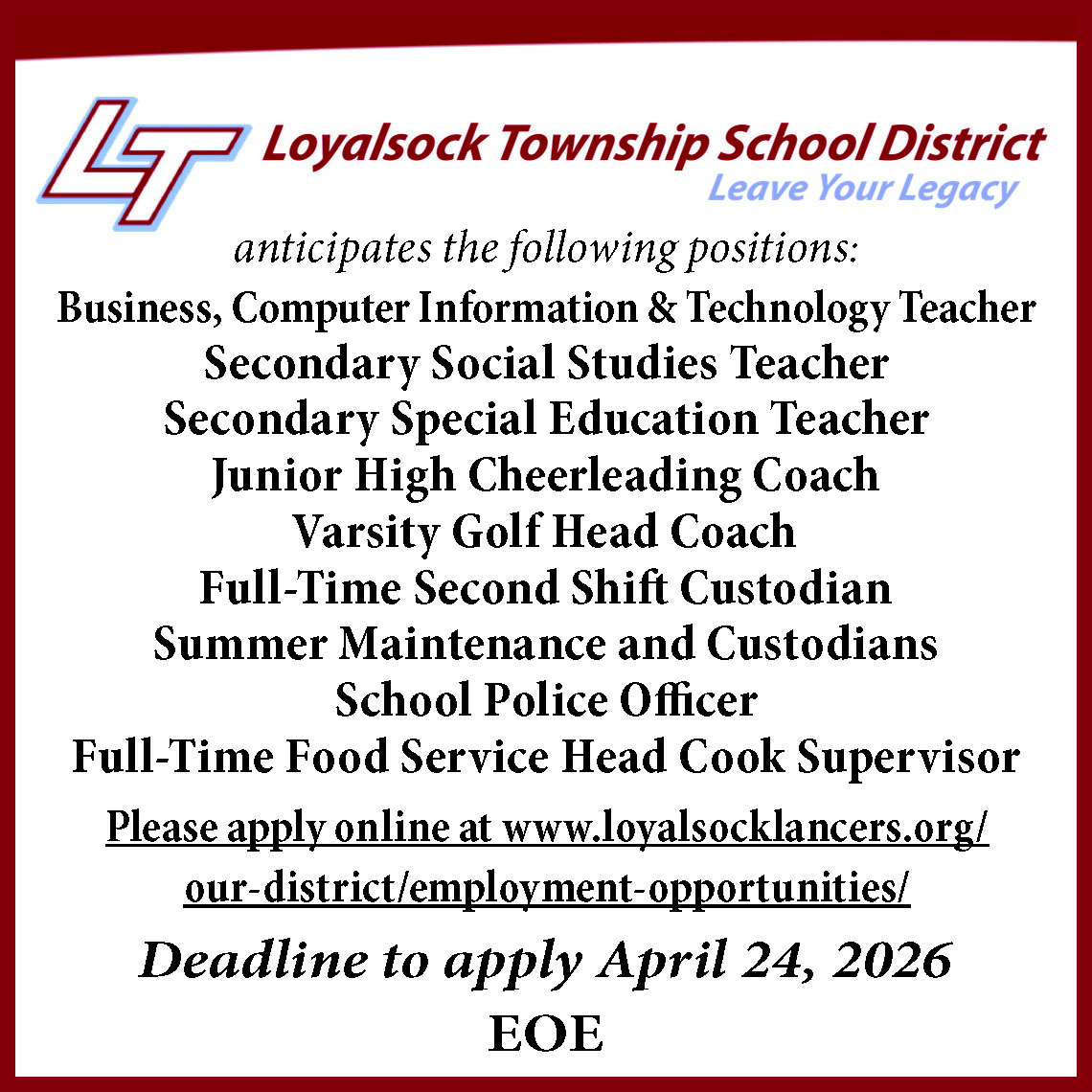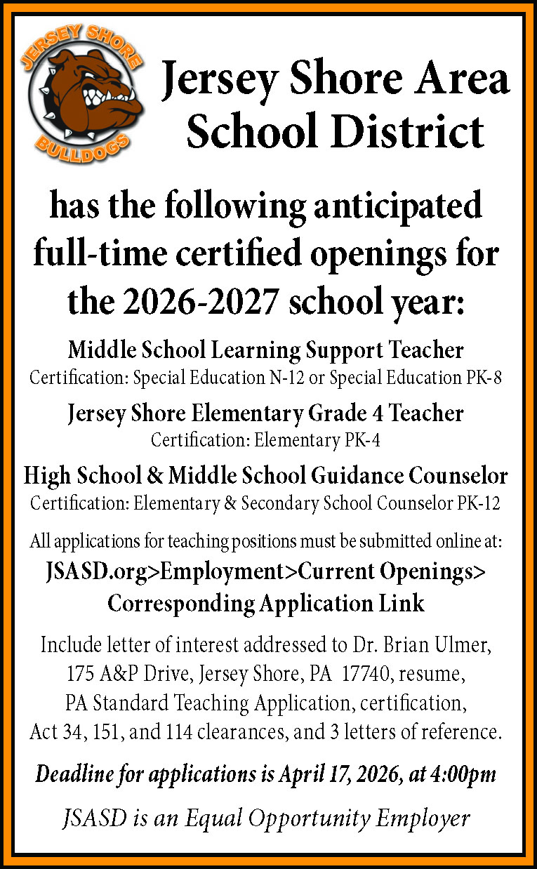 PART-TIME LIBRARY AIDE. Konkle Library in Montoursville seeks part-time library aide for 8-15 hours weekly including every other Saturday. Must be flexible with hours. Knowledge of the computer and library necessary. Hourly rate $8.45. PA State Clearances required if hired. Apply in person at the library for a job description and application. Application deadline: April 18, 2026. 198013